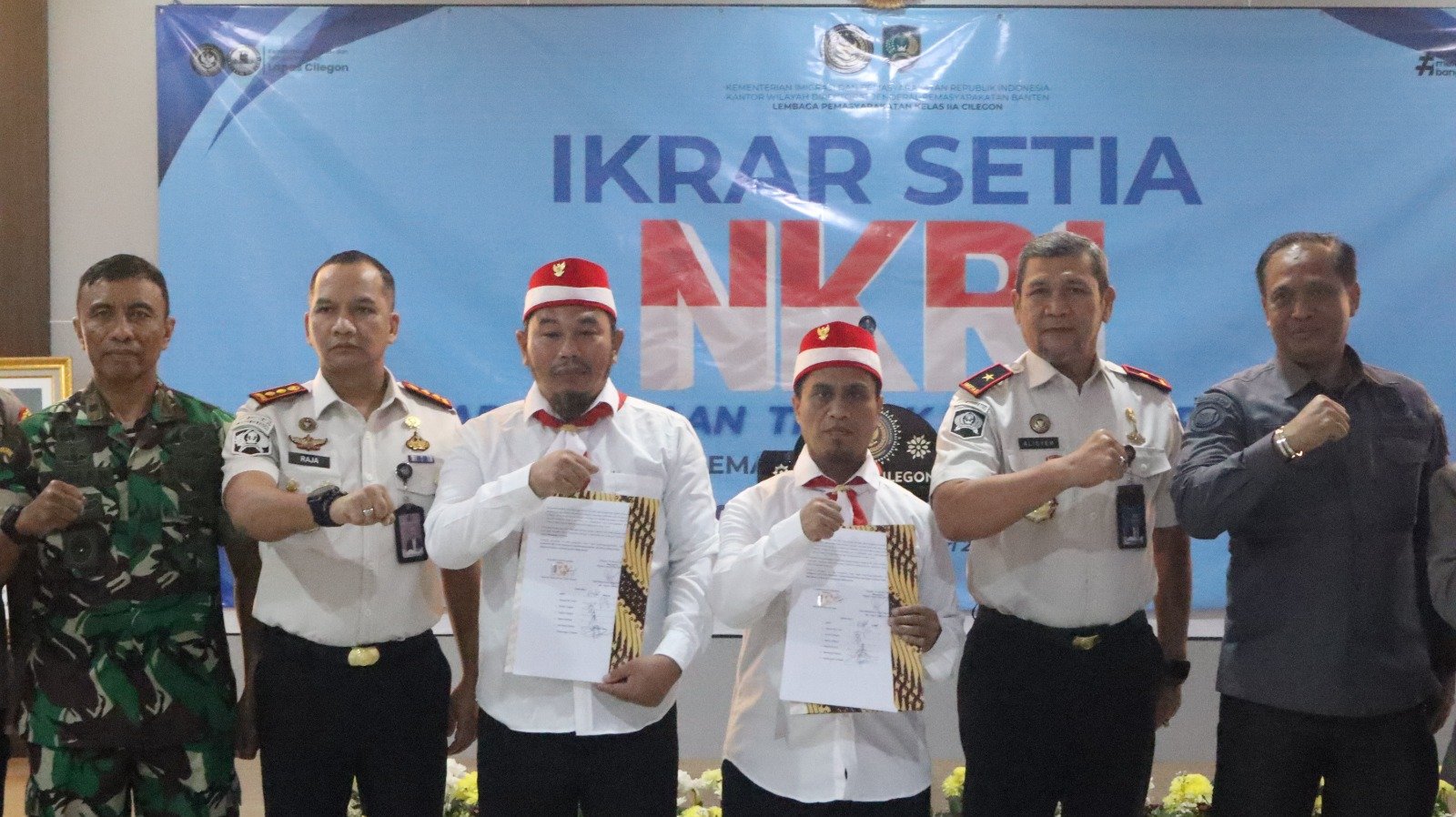 KORANBANTEN.COM-Kantor Wilayah Direktorat Jenderal Pemasyarakatan (Kanwil Ditjenpas) Banten melaksanakan kegiatan Ikrar Setia kepada Negara Kesatuan Republik Indonesia (NKRI) bagi warga binaan tindak pidana terorisme di Lapas Kelas IIA Cilegon. Kegiatan ini berlangsung dengan tertib, aman, dan penuh khidmat serta dihadiri oleh unsur Badan Nasional Penanggulangan Terorisme (BNPT), Densus 88 Antiteror, TNI, Polri, Kementerian Agama, Kesatuan Bangsa dan Politik Kota Cilegon, serta jajaran pemasyarakatan.