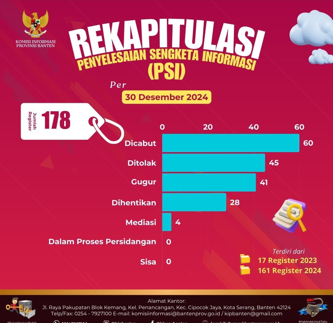 Bahwa Per 31 Desember 2024 terdapat 178 PSI yang diregister di Komisi Informasi Provinsi Banten dengan perincian 161 PSI ditambah dengan 17 PSI ex Tahun 2023, dan berhasil diselesaikan seluruhnya.