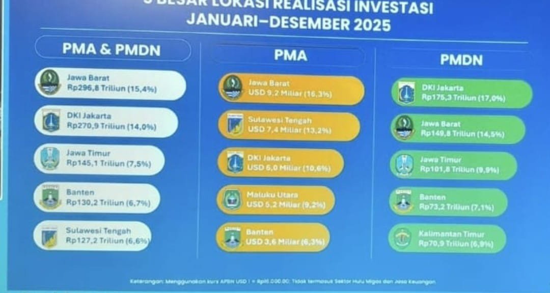 ​Secara kumulatif, total investasi Rp130,2 triliun tersebut terdiri atas Penanaman Modal Dalam Negeri (PMDN) sebesar Rp73,2 triliun dan Penanaman Modal Asing (PMA) sebesar 5,2 miliar dolar AS. Khusus pada sektor hilirisasi, realisasi investasi sepanjang tahun 2025 tercatat mencapai Rp41,3 triliun.