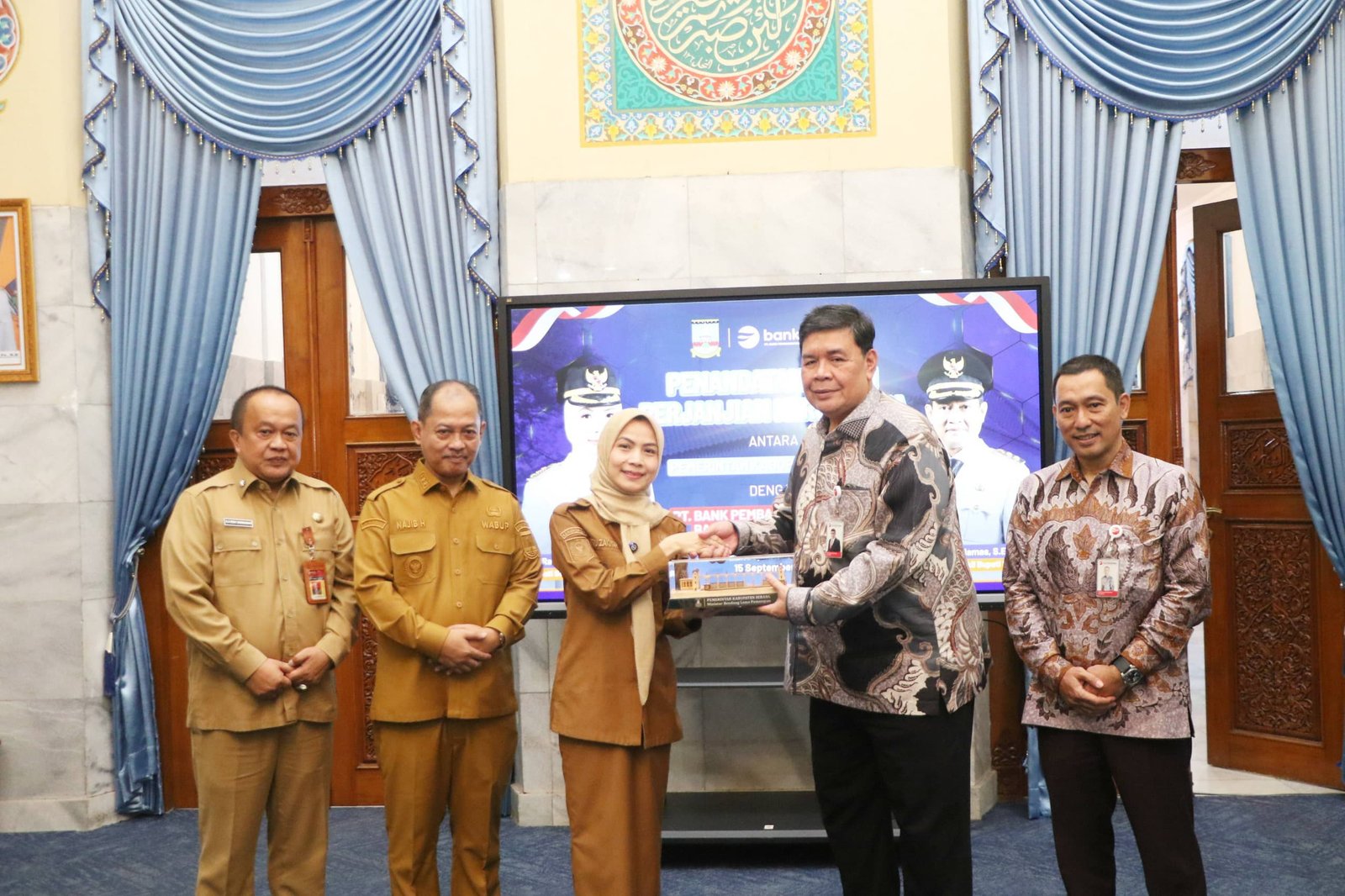 Penandatanganan dilakukan Kepala Badan Pengelolaan Keuangan dan Aset (BPKAD) Kabupaten Serang Sarudin dan Direktur Utama Bank Banten Muhammad Busthami yang disaksikan Bupati Serang Ratu Rachmatuzakiyah, Wakil Bupati Muhammad Najib Hamas dan Sekretaris Daerah (Sekda) Zaldi Dhuhana. Turut hadir juga para Kepala Organisasi Perangkat Daerah (OPD) di lingkungan Pemkab Serang.