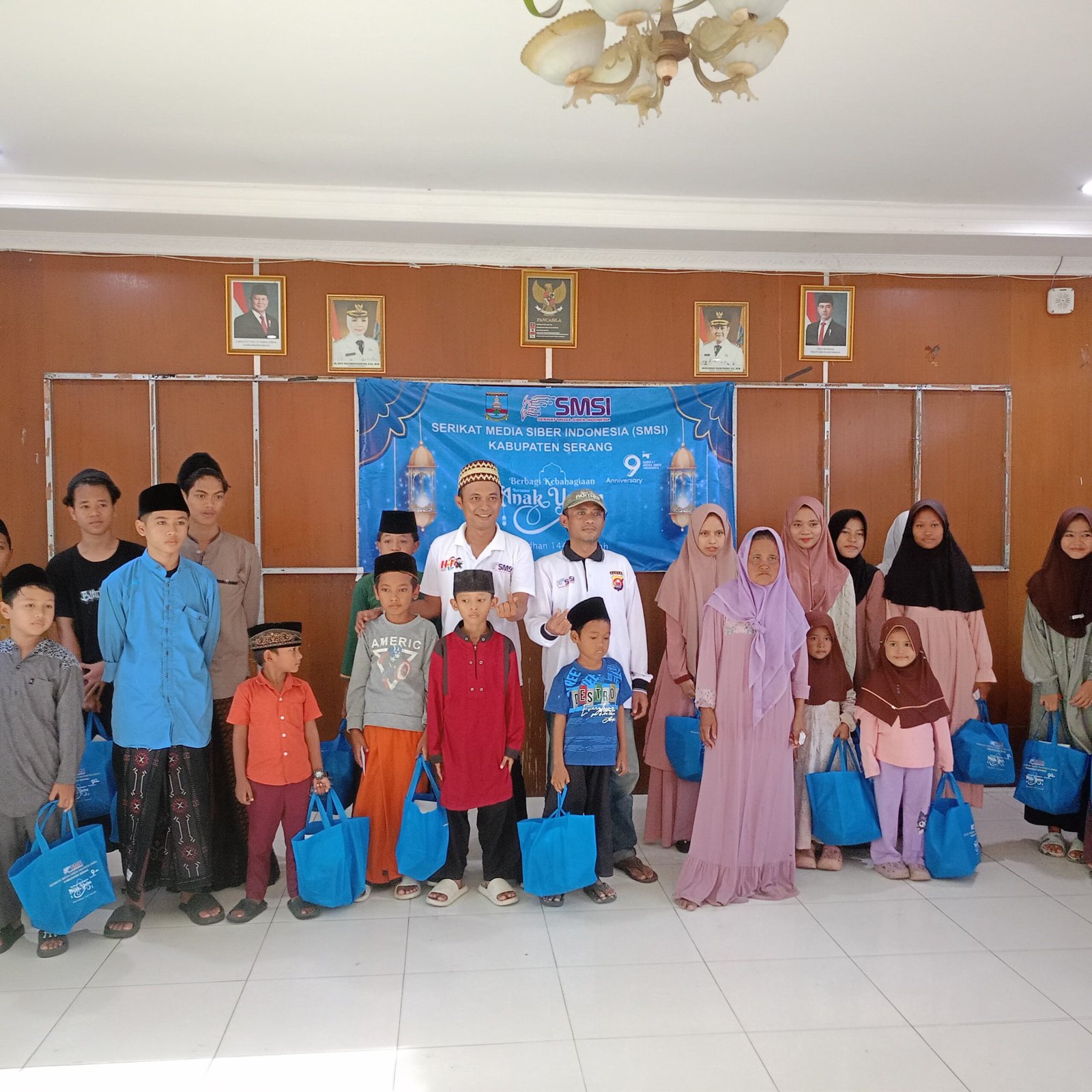 Dalam kegiatan bertajuk “Berbagi Kebahagiaan Bersama Anak Yatim” itu, sebanyak 20 anak yatim menerima bingkisan serta santunan berupa uang tunai dari SMSI Kabupaten Serang.