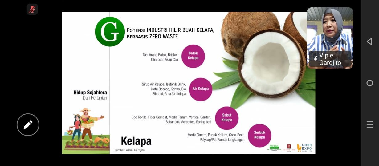“Beberapa nilai tambah dari kelapa diantaranya kayu kelapa dapat digunakan alat rumah, bahan kayu, bahan bangunan, furniture dan lain-lain, sementara daun kelapa dapat digunakan kemasan ketupat, bahan kertas (Pulp), Piring Lidi, sapu lidi, sedangkang buah kelapa dapat dimanfaatkan daging buah kelapa, filter food, dessicated coconut, coconut chip, virgin coconut oil, minyak goreng, margarine dan banyak lagi” ungkap Vipie.
