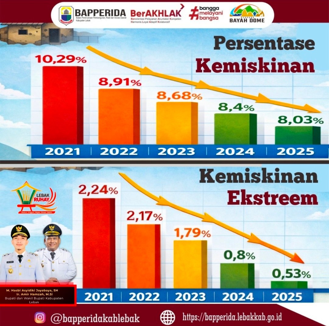 KORANBANTEN.COM-Berdasarkan rilis Badan Pusat Statistik, Tingkat kemiskinan Kabupaten Lebak pada Tahun 2025 menurun menjadi 8,03 persen, sehingga jika dibandingkan tahun 2024 ada penurunan kemiskinan dari 8,4 persen menjadi 8,03 persen. Selain itu penurunan juga terjadi pada Miskin Ekstrim menjadi 0,53 persen dari 0,8 di tahun 2024.