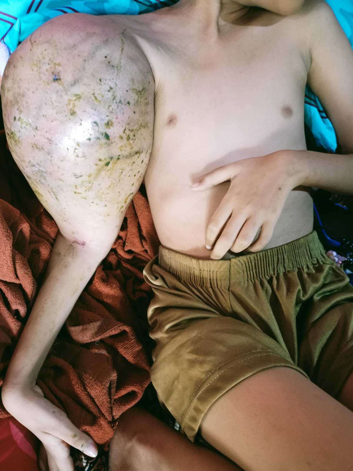 “Semenjak timbul benjolan anak tersebut sudah tidak bersekolah dan tidak bisa bermain kembali, berat benjolan tersebut 2 kilo, keterangan dari rumah sakit katanya kena kanker ganas, dari sekolah 6 bulan lalu baru datang ke rumah dan menyerahkan uang sebesar 6 juta untuk membantu biaya rumah sakit.